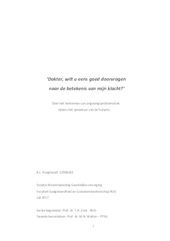 Middels dit afstudeeronderzoek is getracht meer zicht te krijgen op de werkwijze van Noord-Nederlandse huisartsen bij mogelijke zingevings-problematiek van hun patiënten. De nadruk is gelegd op de wijze waarop huisartsen signalen van zingevingsproblematiek (kunnen) herkennen. Naast bestudering van relevante literatuur over zingeving en visies over de samenhang tussen gezondheid, psychologie en zingeving, heeft er een empirisch onderzoek plaatsgevonden waarbij in totaal zes spreekuren bij drie huisartsen zijn geobserveerd. Direct aansluitend zijn de huisartsen via een semigestructureerd interview gevraagd te reflecteren op de mogelijke zingevingsproblematiek van de patiënten en de wijze van herkenning hiervan. Tevens is een door de onderzoeker uit de literatuur gedistilleerd signaleringsraster voorgelegd om te verkennen of dit het herkennen van zingevingsproblematiek zou kunnen vergemakkelijken.
