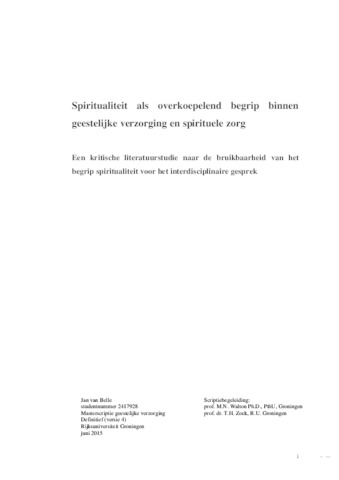 In deze scriptie wordt verslag gedaan van een literatuurstudie naar de wijze waarop het woord ‘spiritualiteit’ wordt gehanteerd in de wereld van de geestelijke verzorging en spirituele zorg1, en van onderzoek dat hiermee verband houdt. De studie onderzoekt een aantal bronnen in de literatuur. Naast de Richtlijn Spirituele zorg, (Agora werkgroep Richtlijn Spirituele Zorg, 2010), die het uitgangspunt vormt voor de studie, betreft dit vooral handboeken en overzichtswerken.
