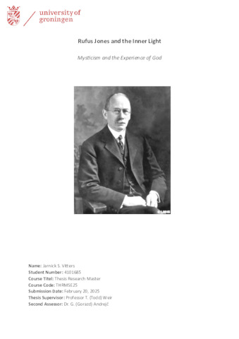 Rufus Jones and the Inner Light: Mysticism and the Experience of God.